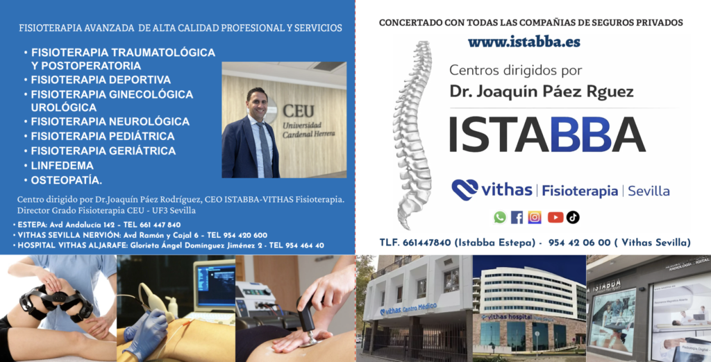 Como siempre, todos estos centros están dirigidos y coordinados por el Dr. Joaquín Páez Rodríguez., Doctor en Fisioterapia por la Universidad de Sevilla, CEO clínica Istabba en Estepa y Área de Fisioterapia Vithas Sevilla. Director del Grado en Fisioterapia CEU Fernando III. Experto en fisioterapia deportiva y traumatólogica, ténicas invasivas ecografías y diagnostico por Imagen en Resonancia Magnética Nuclear